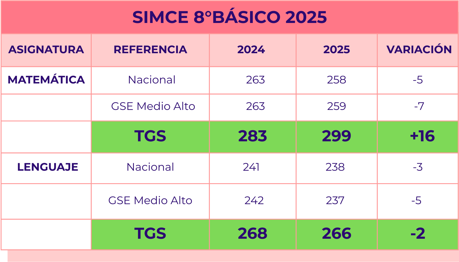 Consistencia en todo nivel: Nuestros alumnos de 8° Básico también demostraron su fuerza con un alza de 16 puntos en Matemática, alcanzando los 299 puntos.